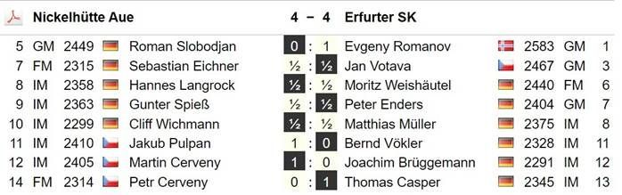 An den Brettern 5 und 6 war Aue im Besitz eines doch deutlicheren Ratingvorteils hier könnte es also statistische Chancen auf einen vollen Punkt geben. Leider reichte es an diesen Brettern letztlich zu 2 Remisen und auch das Gesamtergebnis endete insgesamt friedlich.